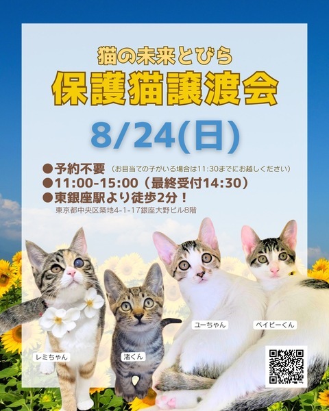 | イベント内容 | 東銀座で保護猫の譲渡会を開催しています「猫の未来とびら」です♪ 恵まれない環境にいる猫たちが未来へのとびらを開いて幸せなご縁に繋がる橋渡しをしていきます。 たくさんの猫ちゃんと保護主・スタッフ一同みなさまのご来場を心よりお待ちしています! 子猫ちゃん〜成猫ちゃんまで参加します♪ 【ご来場いただく皆様には下記についてお願い致します】 ★不織布マスクを着用するしないは自己判断でお願い致します。 ★譲渡会場にお入り頂く前に手洗いと手の消毒をお願い致します。 ★熱のある方や体調の優れない方は譲渡会への来場を見合わせて頂けますよう、お願い致します。 ★来場者数によりましては人数制限もありますので長時間お待たせてする場合もございます。 予めご了承下さい。 ★☆★★☆★★☆★★☆★★☆★★☆★★☆★★☆★★☆★ ★開催日時 2025年8月24日(日) 11:00~15:00(最終受付 14:30) ★会場 東京都中央区築地4-1-17 銀座大野ビル 8階 (東劇となり) ★最寄駅 東銀座駅 6番出口 徒歩2分 銀座駅 徒歩9分 ・築地駅 徒歩7分 駐車場は当ビル又は近隣のコインパーキング等をご利用ください。 会場への直接のお問い合わせはご遠慮くださいませ。 ★☆★★☆★★☆★★☆★★☆★★☆★★☆★★☆★★☆★ 会場で猫ちゃんと触れ合ってご縁を繋いでください。 里親様・猫ちゃんが双方、幸せな家族になれるよう保護主・スタッフがサポート致します。 ご不安な事はお気軽にご相談ください。 入場無料です。事前のご予約は不要です。 当日猫ちゃんの引き渡しはございません。 後日、保護主が里親様宅へお届けいたします。 ※参加予定猫ちゃんは、急な体調不良等で不参加になる場合もございます。 開催当日の朝、当会ブログにて不参加の最新情報を掲載致しますのでご確認をお願い申し上げます。 ◇譲渡に関してのお願い・基本条件 1.家族の一員として終生最期まで愛育下さい。 2.完全室内飼い・ペット可のお住まい(契約書を拝見致します) 3.脱走防止対策 4.避妊・去勢手術 5.里親様のご自宅へのお届け 6.譲渡誓約書への署名捺印・身分証明書の提示 7.医療費譲渡金のご負担 8.定期報告 9.トライアル期間有り ※保護主により譲渡条件は異なりますので会場で直接ご相談ください。 60才以上の方のみのご家庭、未成年の方、単身の方、同棲中の方、 小学生低学年以下のお子様のいる方、必要な脱走対策を施していただけない方は譲渡をご遠慮頂く場合もございますのでご了承ください。 仔猫の場合は主にお世話される方のご年齢は55歳までとさせて頂きます。 オーバーする方はご相談くださいませ。 小さな子猫の譲渡は体重が1kgになってからのお届けやお留守番の無い(少ない)ご家庭を希望いたします。 医療費譲渡金に関しましては詳しくはホームページの 【譲渡に関してのお願い】【譲渡の流れ】をご覧くださいませ。 ~主催 猫の未来とびら~ |