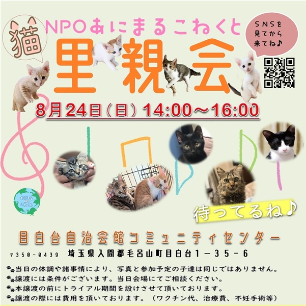 | イベント内容 | 今回は猫だけの会です♪ 子猫は生後3カ月~半年以上経ってなかなか決まらない子まで、甘えん坊な成猫さんもいます! 必ず、直前に更新されるSNSをチェックをしてからお越しください♪ 日常ケアサービスやグッズ販売もあります♪ ※先着順ではなく里親会後に協議してより良い条件のご家族を選定させて頂いておりますので、お時間早い方が有利という事はありません^^ |
