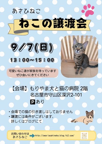 | 開催場所 | 名古屋市守山区深沢2-101, もりやま犬と猫の病院 2F | ||