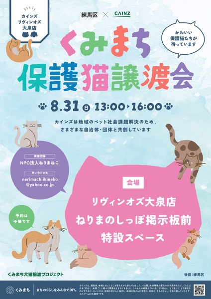 | イベント内容 | 可愛い人なれした猫6~8匹が参加予定 参加猫一覧はこちら https://ameblo.jp/nerimaneko/entry-12918360261.html 事前のお見合いができます。気になる猫は、お早目にご相談ください。 譲渡先が決まった猫は参加しません。 |