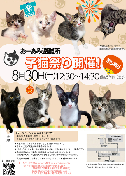 | イベント内容 | ☆★☆★☆★☆★☆★☆★☆★☆★☆★☆★☆★☆★☆ ~8月30日(土)市ヶ尾にて子猫祭り譲渡会開催!~ ◎場所・・「スペースbaobab」 神奈川県横浜市青葉区市ヶ尾町1154-2 市ヶ尾プラーザビル1F アルファード商店内 田園都市線「市が尾」駅西口より徒歩約30秒 ◎日程・・8月30日(土)(雨天決行) ◎時間・・ 12:30~14:30 (会場に利用可能な駐車場はございません。近隣のコインパーキングをご利用ください。) *参加の際は、アルコール消毒のご協力をお願いいたします。 *混雑状況により、入場制限をさせていただく場合がございます。 ※参加予定の猫は体調により参加できない場合があります。ご了承ください。 ☆★☆★☆★☆★☆★☆★☆★☆★☆★☆★☆★☆★☆ |