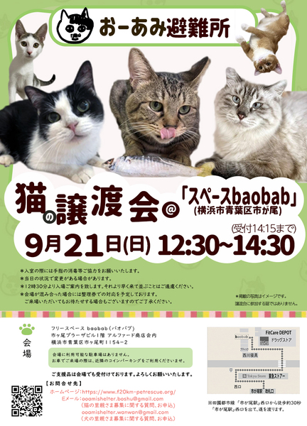| イベント内容 | ☆★☆★☆★☆★☆★☆★☆★☆★☆★☆★☆★☆★☆ ~9月21日(日)市ヶ尾にて譲渡会開催!~ ◎場所・・「スペースbaobab」 神奈川県横浜市青葉区市ヶ尾町1154-2 市ヶ尾プラーザビル1階アルファード商店会内 田園都市線「市が尾」駅西口より徒歩約30秒 ◎日程・・9月21日(日)(雨天決行) ◎時間・・ 12:30~14:30 (会場に利用可能な駐車場はございません。近隣のコインパーキングをご利用ください。) *参加の際は、アルコール消毒のご協力をお願いいたします。 *混雑状況により、入場制限をさせていただく場合がございます。 ※参加予定の犬猫は体調により参加できない場合があります。ご了承ください。 ☆★☆★☆★☆★☆★☆★☆★☆★☆★☆★☆★☆★☆ |