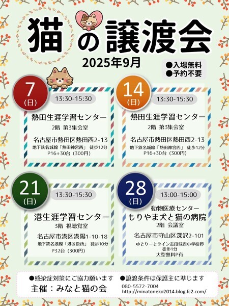 | イベント内容 | ◆暮らしに、猫と笑顔を◆ 家庭や暮らしの中に「猫」が加わるだけで、空気がぐっと柔らかくなります。譲渡会では、落ち着いた性格の猫や子育て家庭向きの猫も紹介しています。生活リズムに合うパートナーは必ず見つかります。まずは実際に会って、猫との暮らしを想像してみませんか? ●会場は ・駐車場16台+30台有(利用料300円) ・予約不要&入場無料 ●参加猫一覧 http://minatoneko2014.blog.fc2.com/blog-entry-1864.html ●参加猫は ・子猫も成猫も全頭ワクチン接種済 ・ノミダニ駆除済 ・トイレ躾済 ・ケージレストのトレーニング済 ●参加する猫たちについて 基本治療やトイレのしつけは済んでいます 足りないのは共に生きる新しい家族だけです 「譲渡会は行ったことがなくて不安…」 「猫を飼うのははじめて」 「今すぐじゃないけどいずれ猫と暮らしたい」 そんな皆様も大歓迎! ●譲渡に関して ※完全室内飼い・誓約書・治療費負担等の 諸条件があります。 ※譲渡やトライアルに関する契約条件は 猫の保護主によって異なります。 ●譲渡会その他についての問い合わせは みなと猫の会 minatonekonokai@gmail.comもしくは 080-5572-7004 までお願いします。 ★参加猫ちょこっと紹介★ 写真2枚目 ほーちゃん ♀ 3ヵ月半 人なれバツグン!初めての人にもゴロゴロの甘えん坊です 譲渡の流れなど詳しくは下記ブログをご覧ください。 ◎主催者ブログ みなと猫の会 ~こぴっと猫だより~ http://minatoneko2014.blog.fc2.com/ |