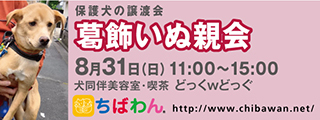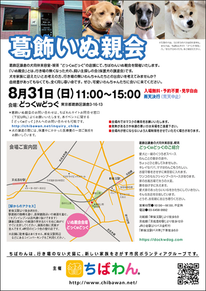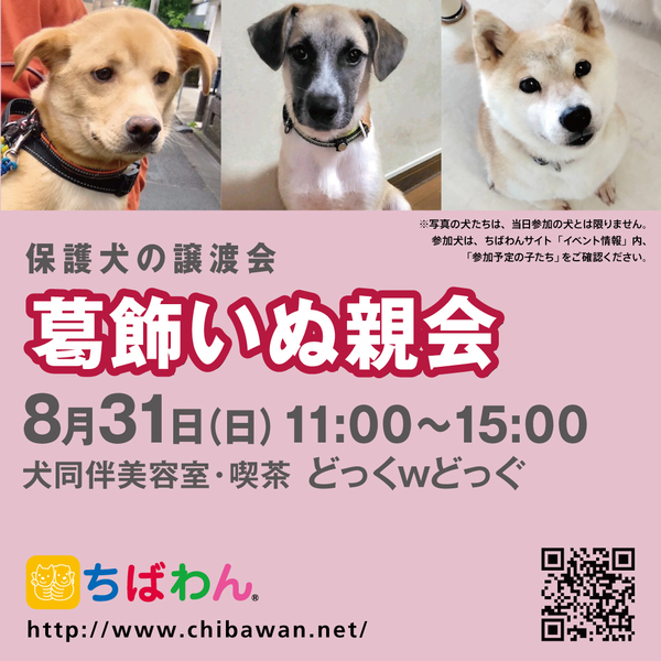 | イベント内容 | 葛飾区鎌倉のいぬ同伴美容室・喫茶“どっくwどっぐ”の店舗にていぬ親会を開催します。 可愛い保護わんこたちが新しい家族との出会いを求めて参加します!! いぬ親会見学は予約等必要ありません。 是非、ご家族同伴でご来場下さい。 【ちばわんからのお願い】 ◆会場内ではマスクの着用をお願いします。 ◆発熱がある方や体調が悪い方は来場をご遠慮ください。 ◆会場内が密にならないよう入場制限をさせていただく場合があります。 開催日:8月31日(日)11:00~15:00 室内開催 雨天決行 場所 :どっくwどっぐ 東京都葛飾区鎌倉3-16-13 【駅からのアクセス】 新柴又駅より徒歩約5分。 駅直結の陸橋を通り、高架線路沿いの細道を進みます。 (セブンイレブンは店内通り抜けできます) 鎌倉公園沿いの細道の突き当たりを右に曲がりすぐに左折してください。 道路右側に民家が並んでいます。4軒目のピンク色の壁の店です。 ※店舗に駐車場はありません。 当日お車の方はコインパーキングをご利用ください。 《注意事項》 【当日の流れ】 (1)家族募集中のいぬとお会いになりたい方はどなたでも自由にご参加いただくことができます。ちばわんボランティアは名札をつけておりますので、ご遠慮なくお声をかけて下さい。また、募集中のいぬのそばには預かりボランティアが控えておりますのでいぬの性格や生活習慣など、遠慮なくご質問ください。 (2)ご希望のいぬが決まったら、お申し込みアンケートにご記入の上、ボランティアにお渡し下さい(前日までにメールでアンケートを送信してお申し込みいただくこともできます。) ◆「いぬ」アンケート送信先:https://chibawan.net/contactform_dog (3)アンケート内容を拝見し、お話させていただきます。 (4)原則として一両日中にお返事の連絡をさせていただきます。 (5)ご縁が成立した場合には、後日、こちらからご自宅までいぬをお届けし、約1ヶ月のお試し生活に入っていただきます。お届けの際に、書面での譲渡契約書を交わします。 ※ワクチン・不妊手術代など保護犬にかかった費用は、家族になるいぬ親さんにもご負担をお願いしています。 《お知らせ》 会場ではチャリティグッズを販売します。 売上金は保護した犬猫の医療費など、 ちばわん活動費として大切に使わせていただきます。 いぬ親会について:https://chibawan.net/inquiry_dog_other ※いぬ親会当日はメールが見られません。また、お問い合わせの際は、必ず「具体的な件名」を入れて多数の迷惑メールと区別がつくようにお願いいたします。 いぬ親会ホームページ https://chibawan.net/event/20250831katsushika-dog ちばわんホームページ https://chibawan.net/ |