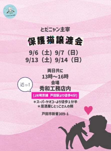 | イベント内容 | 子猫のみの譲渡会を開催致します。 日程 ①9月6日(土) 13:00~16:00まで ②9月7日(日) 13:00~16:00まで ③9月13日(土) 13:00~16:00まで ④9月14日(日) 13:00~16:00まで 場所 秀和工務店 JR埼京線 戸田駅 東口 徒歩4分 住所 〒335-0021 埼玉県戸田市新曽309−1 ヤオコーから徒歩90秒のところにあります。 室内開催のため雨天でも開催します。可愛い子猫が6頭並びます。 茶白 らいちちゃん 4ヶ月 黒猫 あさりちゃん 4ヶ月 キジトラ アイちゃん 3.1ヶ月 キジトラ マイちゃん 3.1ヶ月 キジトラ ミーちゃん 3.1ヶ月 キジトラ マインちゃん 3.1ヶ月 急変しやすい時期も超え安定しています。お留守番が長いお家でも大丈夫です。 当会の譲渡会は予約制ではありません。 どうぞお気軽にお越し下さいませ。 子猫の様子はブログをご覧になって下さい。 アメブロ https://ameblo.jp/sakutotaro203/ インスタ @toda_nyan 注意:子猫の場合トライアルはありません。良くお考えの上、お申込み下さいませ。 いつもながらのお願いですみません。 募金箱を設置します。 募金のご協力をお願い致します。 フード、トイレ砂のご支援を お願い致します。 銘柄なんでもOK。 開封済みOK。 但し賞味期限以内のものでお願い致します。 頂いたフードは餌やりさんにもお裾分けしています。 どうぞよろしくお願いいたします。 主催 とだニャン 協力 秀和工務店 |