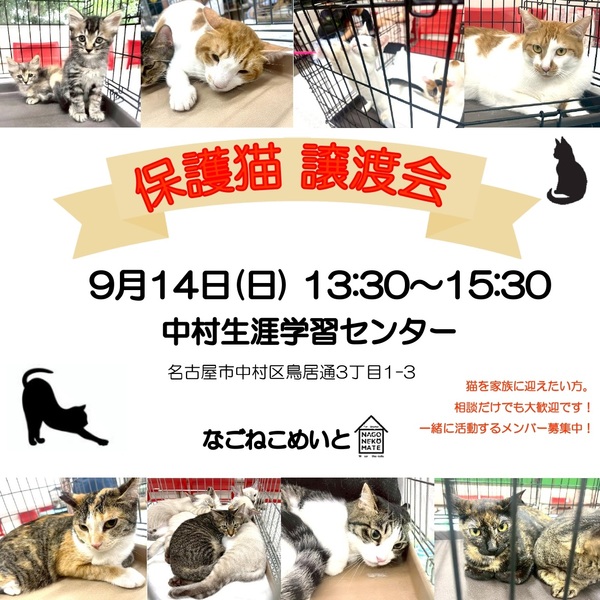 | イベント内容 | 猫の譲渡会を毎月定期的に開催しています。 様々な環境で保護された猫たちが、新しい家族との出会いを待っています。 かわいい子猫も落ち着いた成猫もたくさん参加します! 初めて猫をお迎えしたい方、多頭を検討されている方、相談だけでも大歓迎です! アットホームな雰囲気なので、譲渡会が初めての方でもお気軽にお越しください☆ 些細な質問でもスタッフにお尋ね頂けたら丁寧にお答え致します。 是非お越しください♪ |