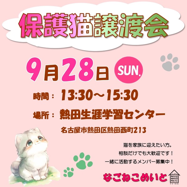 | イベント内容 | 猫の譲渡会を毎月定期的に開催しています。 様々な環境で保護された猫たちが、新しい家族との出会いを待っています。 かわいい子猫も落ち着いた成猫もたくさん参加します! 初めて猫をお迎えしたい方、多頭を検討されている方、相談だけでも大歓迎です! アットホームな雰囲気なので、譲渡会が初めての方でもお気軽にお越しください☆ 些細な質問でもスタッフにお尋ね頂けたら丁寧にお答え致します。 是非お越しください♪ |