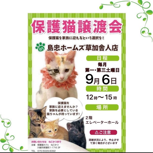 | イベント内容 | *保護猫譲渡会* 日時:9/6(土) 12時~15時 場所:ホームズ草加舎人店さま 島忠ホームズ草加舎人店さま譲渡会に参加予定です。 センターからの引き出し、飼育崩壊や所有権放棄などで、生きる場所を失った猫たちが、最大限の医療にかけてピカピカになりました。 写真の猫の他にも甘えっこちゃんたちが、溢れる笑顔でお待ちしています。 ぜひご参加ください。 ***譲渡条件*** *完全室内でお願いします *逸走防止対策にご協力頂ける方 *写真付きの身分証をご提示頂ける方 *LINE若しくはメールでのやりとりが可能な方 *譲渡に関する覚え書きにご署名頂ける方 *初期医療費をご負担頂ける方 *その他の譲渡条件を、譲渡会場でお話させて頂ける方 *猫が生まれた年から20年後に、80歳を超えていない方 *お一人暮らしの方は、後見人さまのご同席が必要です |