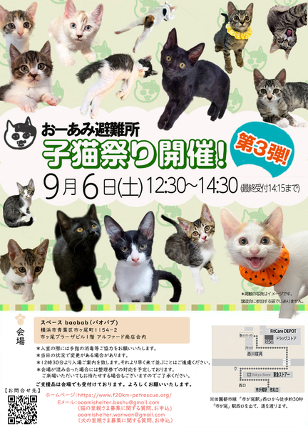 | イベント内容 | ☆★☆★☆★☆★☆★☆★☆★☆★☆★☆★☆★☆★☆ ~9月6日(土)市ヶ尾にて子猫祭り第3弾開催!~ ◎場所・・「スペースbaobab」 神奈川県横浜市青葉区市ヶ尾町1154-2 市ヶ尾プラーザビル1F アルファード商店内 田園都市線「市が尾」駅西口より徒歩約30秒 ◎日程・・9月6日(土)(雨天決行) ◎時間・・ 12:30~14:30 (会場に利用可能な駐車場はございません。近隣のコインパーキングをご利用ください。) *参加の際は、アルコール消毒のご協力をお願いいたします。 *混雑状況により、入場制限をさせていただく場合がございます。 ※参加予定の猫は体調により参加できない場合があります。ご了承ください。 ☆★☆★☆★☆★☆★☆★☆★☆★☆★☆★☆★☆★☆ |