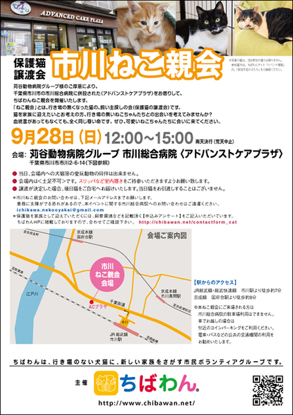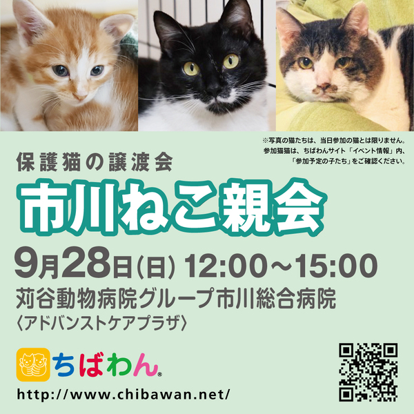 | イベント内容 | https://chibawan.net/event/2025-09-28-ichikawa-cat 苅谷動物病院様のご厚意により、千葉県市川市の市川総合病院にに併設された<アドバンストケアプラザ>をお借りして、「ちばわんねこ親会」を開催いたします。 是非カワイイねこたちに会いに来てください♪ ※会場は土足禁止です。室内履きをご持参ください。 ※ポスターの猫が参加するとは限りません。参加猫に関してはHPのイベント情報をご覧ください。 ※会場への直接のお問い合わせはご遠慮ください。 開催日 2025年09月28日(日)12:00〜15:00 場所 苅谷動物病院グループ 市川総合病院 <アドバンストケアプラザ> 〒272-0034 千葉県市川市市川2-6-14 アクセス JR総武線・総武快速線 市川駅より約徒歩7分 京成線 国府台駅より約徒歩8分 ※ねこ親会にご来場される方は市川橋病院の駐車場は利用できません。 車でお越しの際は、付近のコインパーキングをご利用ください。 路上駐車は絶対にお止めください。 駅からも近い場所ですので電車・バスなどの公共の交通機関の利用をお勧めいたします。 |