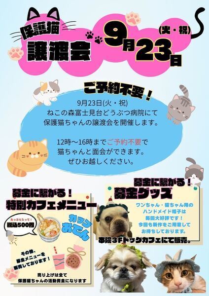 | イベント内容 | 【譲渡会終了のお礼とご報告】 先日は保護猫譲渡会にご来場いただき、本当にありがとうございました? 今回の譲渡会は過去最高の盛況ぶりとなり、開始前から列ができるほどたくさんの方々にお越しいただけました? 近場の方から遠方の方まで、猫ちゃんたちに会いに来てくださり、スタッフ一同心から感謝しております✨ 恒例のハンドメイドグッズは時間ぴったりに買いに来てくださる方もいらっしゃり、あっという間に完売となりました? 「ハンドメイドグッズを買いたかった!」とお声かけいただいた方もいて、本当に感激です? カフェフードのハヤシライスも大変好評で、こちらも完売となりました? 同時開催した本院でのミニ祭りも、多くの方々にお楽しみいただけました? 保護猫室と診察室にケージを配置したことで、ゆったりと猫ちゃんたちとの時間を過ごしていただけたようで、たくさんの里親申し込みもいただくことができました? 皆さまお一人お一人の優しさに支えられていることを実感し、本当に感謝の気持ちでいっぱいです? 次回もまた、皆さまと猫ちゃんたちの笑顔あふれるひとときをご一緒できることを楽しみにしています! 今後ともどうぞよろしくお願いいたします? ねこの森 富士見台どうぶつ病院 スタッフ一同 ねこの森保護猫譲渡会 ━━━━━━━━━━━━━━━ ◇開催詳細◇ 2025年9月23日(火・祝) 12:00~16:00 ※予約不要・参加費無料 ━━━━━━━━━━━━━━━ \現在の保護猫たち/ ・スタッフが日々愛情たっぷりでお世話・ケアをしています ・人懐っこい子から少し恥ずかしがり屋さんまで個性豊かな子たちがお待ちしています! ・猫同士の相性も抜群です ◆会場◆ ねこの森 富士見台どうぶつ病院 〒165-0031 東京都中野区上鷺宮4-15-7 富士見台駅から徒歩2分 TEL:03-3825-1111 \駐車場情報/ ・本院横:2台 ・提携コインパーキング:3台 ※計5台駐車可能 ――――特別企画―――― ハンドメイドグッズ販売 本院3階ドッグカフェにて ワンちゃん猫ちゃん用品を販売 ※売上は全て保護猫活動資金になります 特別カフェメニュー ★おでんカップ★ たっぷり入って税込500円 その他募金メニューも多数ご用意 ※売上は全て保護猫活動資金になります ――――参加時の注意―――― ・必ず靴下の着用をお願いします ・獣医師常駐の安心な環境です ・当日の譲渡は行っておりません ――――――――――――――― \\譲渡について// ・健康診断・ワクチン接種済 ・譲渡費用に医療費を含みます ・終生飼育が可能な方 ・ペット可物件にお住まいの方 ・単身者や60歳以上の方には安心の保証プランをご用意 ★・・・事前見学・・・★ YouTubeライブ配信実施中!こちらで保護猫ちゃんの普段の様子が見られます! https://youtube.com/channel/UCtM-h7mwQraxaT7-WIWC_lw?si=gyQFaZK5zpAJN8cY ━━━詳しい譲渡条件━━━ 当院HPをご確認ください https://fujimidai-ac.com/ Instagramも更新中! https://www.instagram.com/nekonomori2222/?locale=ja_JP |