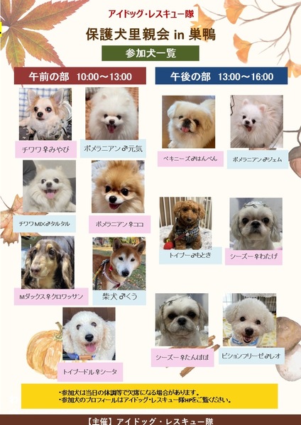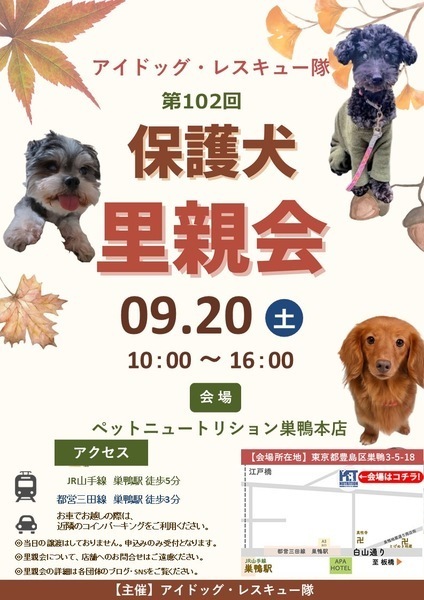| イベント内容 | 【第102回アイドッグ里親会(巣鴨)のお知らせ】 以下の通り、里親会を開催します。 ⚫︎日時:9月20日(土) 10:00 ~ 16:00 ※入れ替え制 (10:00〜13:00/13:00〜16:00) ⚫︎会場:ペットニュートリション巣鴨本店 東京都豊島区巣鴨3-5-18 ⚫︎最寄駅 JR山手線 巣鴨駅より徒歩5分 都営三田線 巣鴨駅より徒歩3分 ※お車でお越しの際は、近隣のコインパーキングをご利用ください。 ※会場内は密になりやすいため、マスクの着用は自己責任にてご判断お願いします。 ⭐️皆様のお越しをお待ちしています⭐️ |