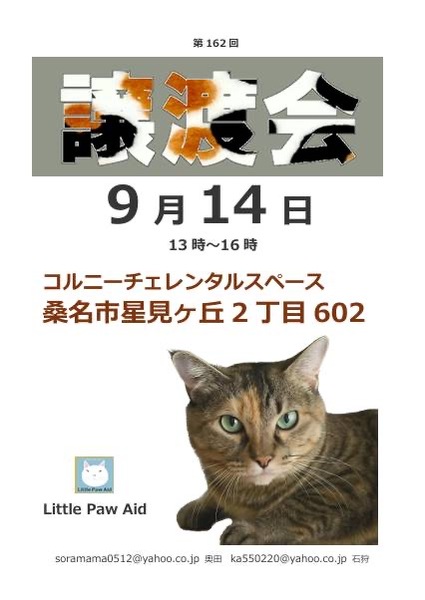 | イベント内容 | 日時 9月14日(日)13時~16時 場所 セオコルニーチェレンタルスペース 三重県桑名市星見ヶ丘2丁目 子猫はいませんが可愛い成猫が参加します 慣れてない子もゴロゴロの甘えん坊もみんな個性的で可愛いです 猫を飼いたいと思っている方も猫を見てみたいと思っている方もお気軽に遊びに来て下さい それぞれの保護主により譲渡条件があります 当日猫を連れ帰る事はできません。 参加猫は保護主のブログで確認ください。 ◆参加者 リトルパウエイド https://blog.goo.ne.jp/ka550220/e/da0fa7f743a938b9030d35e95e0a0263 http://blog.livedoor.jp/cats_voice_pawaid/ ほんわか猫な日々 https://blog.goo.ne.jp/soramama はるごまいけのブログ http://ameblo.jp/harugoma3futagozaru/ 予約は不要です 連絡先 soramama0512@ezweb.ne.jp 奥田 |