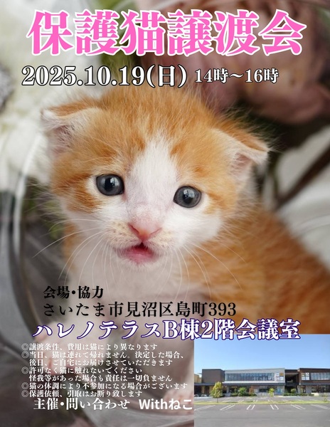 | イベント内容 | 留守時間が長いおうちでも 一緒に過ごせる おとな猫も多数参加します いいご縁を結びにいらしてください ☆参加予定猫についてはこちらをご覧ください→開催1週間前にYoutubeにて公開 https://www.youtube.com/@withneko2222 ※当日、猫の体調・里親決定の場合は不参加になる場合がございます さいたま市近郊で活動している個人ボランティアさんが参加する 冷暖房完備の会議室をお借りして区切られたお部屋で ゆっくり猫と触れ合える環境でのアットホームな譲渡会です 大切に育ててきた子猫から大人猫までが参加します 入場は無料です ☆2019年3月より開催しております こちらの会場で しあわせにゃんこになった数は 400匹以上です ☆一匹一匹清潔な環境で丁寧に健康管理に気を付けて育てています※必要医療は全てかけています ☆里親様のご年齢により 高齢の猫の譲渡も行っています ☆初めて猫を飼う方でも不安がないよう アドバイスさせていただきます 【ご支援のお願い】 おうちで購入したけど食べなかったキャットフード・ペットシート・猫砂等ございましたら お持ちいただければ助かる命があります。ご協力お願いいたします 協力・会場 http://hare-terra.com ハレノテラスB棟 2階会議室【無料駐車場320台】 所在地 埼玉県さいたま市見沼区島町393番地 |