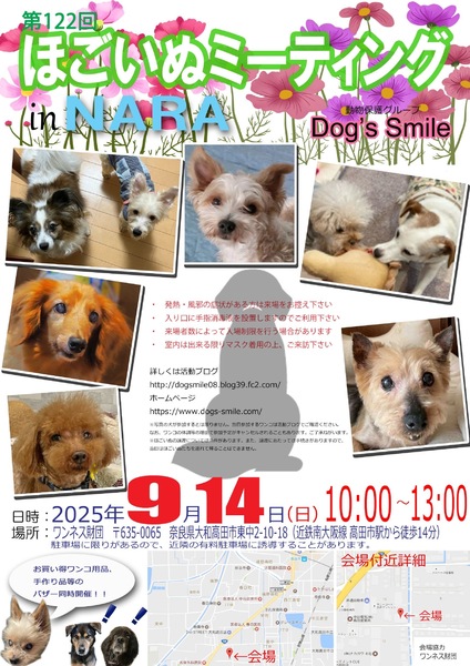 | イベント内容 | 9月14日(日曜日)10時~13時、奈良県大和高田市のワンネス財団エモーショナルリテラシーセンターをお借りして「第122回ほごいぬミーティングat奈良大和高田」を開催します。 保護犬を家族に迎えようと考えている方、保護犬に会ってみたい方、保護犬について知りたい方、ぜひご来場ください。 相性を見るためなど先住わんこさん、卒業わんこさんのご参加ももちろんOKです。 当日は、Dog's smileグッズやワンコ用品の販売、Dog's smileを応援してくださる方々が手作りされた手作り雑貨などの販売も行います。どれもお買い得です。 また、売り上げは、私たちの活動資金になります。ぜひご協力をお願いします。 来場者のみなさまには、感染症の予防に御協力をお願いします。 ・発熱・風邪の症状のある方の入場は御遠慮願います。 ・入場時は、手指消毒への御協力をお願いします。 ・来場者の状況により、入場制限を行う場合があります。 なお、来場予定のワンコについては、活動ブログでご確認ください。 日時 令和7年9月14日(日)午前10時~午後1時 場所 ワンネス財団エモーショナルリテラシーセンター 奈良県大和高田市東中2-10-18 (近鉄南大阪駅高田市駅から南に徒歩14分) 協力 ワンネス財団、株式会社松田電気工業 |