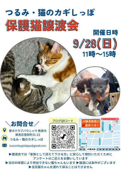 | イベント内容 | 9月28日(日)つるみ・猫のカギしっぽ 定例譲渡会を開催いたします 横浜市鶴見区豊岡町31-23 愛犬クラブバウニャウ 教室内 午前11時~午後3時 お問い合わせ先: tsurumikagishippo@gmail.com 予約は不用です 感染予防のため: ①室内ではマスクを着用していただきます ②入場時にアンケートをご記入いただきます (連絡先等を含む) お問合せは会のメールアドレスにお願いいたします。 tsurumikagishippo@gmail.com 会の譲渡条件をあらかじめ御覧くださいませ (ブログ右上に「ご確認ください」とあります) |