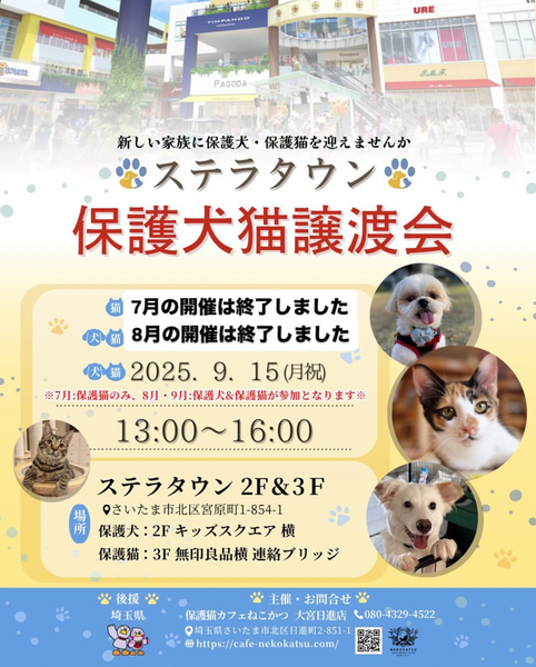 | イベント内容 | *保護猫譲渡会* 日時:9/15(月・祝)13時~16時 場所:ステラタウンさま 飼育崩壊や所有権放棄などで、生きる場所を失った猫たちが、最大限の医療にかけてピカピカになりました。 写真の猫の他にも甘えっこちゃんたちが、溢れる笑顔でお待ちしています。 ぜひご参加ください。 ***譲渡条件*** *完全室内でお願いします *逸走防止対策にご協力頂ける方 *写真付きの身分証をご提示頂ける方 *LINE若しくはメールでのやりとりが可能な方 *譲渡に関する覚え書きにご署名頂ける方 *初期医療費をご負担頂ける方 *その他の譲渡条件を、譲渡会場でお話させて頂ける方 *猫が生まれた年から20年後に、80歳を超えていない方 *お一人暮らしの方は、後見人さまのご同席が必要です |