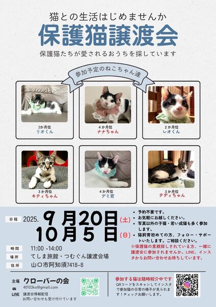 | イベント内容 | 保護猫譲渡会をてしま旅館・つむぐん譲渡会場で 開催します。 まだまだ参加予定の子猫と成猫います。 来て、見て、ナデナデしてください。 そして皆さんの猫愛のお話も聞かせてください! 猫好きさんの集まる譲渡会です。 猫飼育初めての方も是非お越しください。 フォロー、サポートさせていただきます。 ※保護猫の里親探しされている方、譲渡会に一緒に参加されませんか。 インスタDMからお問い合わせよろしくお願いします。 https://www.instagram.com/kurobanokai/ #つむぐん譲渡会 #クローバーの会 #保護猫 #山口市 #拡散希望 |