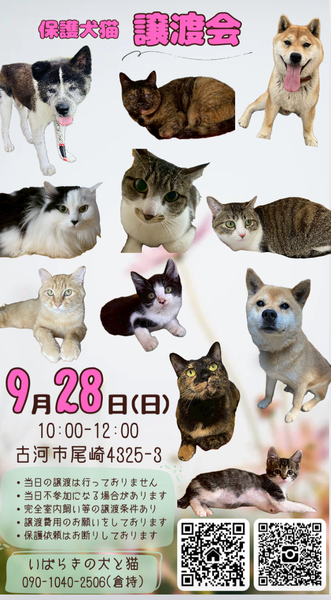| イベント内容 | アットホームな小さな譲渡会です♪ 保護犬猫を家族に迎えてみませんか? ずっとのおうちを待っています 迎えたい方も会ってみたい方もどなたでも大歓迎です♪ 保護っ子 元気いっぱいお待ちしております!! 予約不要/雨天決行/駐車スペース有 (開催場所が分かりにくいので下記の連絡先までご連絡頂ければご案内致します) ※譲渡条件などありますので当会の里親募集ページやHPをご確認ください※ 【不要になったフード(未開封).タオル.ペットシートなどありましたら、ご寄付いただけると助かります】 ⚫︎お問合せ⚫︎ 電話▷090-1040-2506 (クラモチ) LINE ID▷ 717217 (モトハシ) |