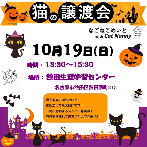 | イベント内容 | 猫の譲渡会を毎月定期的に開催しています。 様々な環境で保護された猫たちが、新しい家族との出会いを待っています。 かわいい子猫も落ち着いた成猫もたくさん参加します! 初めて猫をお迎えしたい方、多頭を検討されている方、相談だけでも大歓迎です! アットホームな雰囲気なので、譲渡会が初めての方でもお気軽にお越しください☆ 些細な質問でもスタッフにお尋ね頂けたら丁寧にお答え致します。 是非お越しください♪ なごねこめいとインスタ↓ https://www.instagram.com/nagonekomate/ |