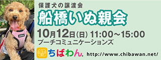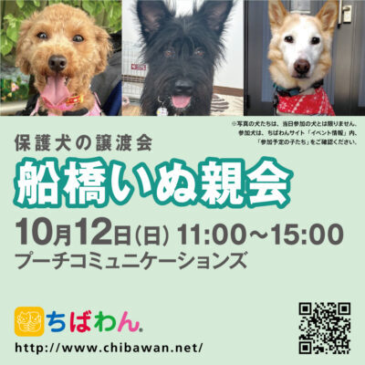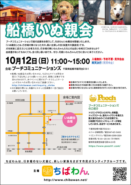 | イベント内容 | 10月船橋いぬ親会のご案内です。 poochさんのご厚意により、プーチコミュニケーションズ(船橋市駿河台)のドッグランをお借りして「船橋いぬ親会」を開催することになりました。 屋根付きのドッグランでの開催になります。 【ちばわんからのお願い】 ①会場内ではマスクの着用をお願いします。 ②発熱がある方や体調が悪い方は来場をご遠慮ください。 ③会場内が密にならないよう入場制限をさせていただく場合があります。 開催日:10月12日(日)11:00~15:00 屋外開催(屋根付きドッグラン) 小雨決行 場所:プーチコミュニケーションズ 千葉県船橋市駿河台2-9-1 【アクセス】 飯山満駅から徒歩約20分 JR東船橋駅から徒歩約20分 県道8号線 吹上交差点~駿河台交差点間にあるファミリーマートの裏手になります。 リサイクルショップとファミリーマートの間の道へ進み、最初のT字路を左折してください。 ※店舗の駐車場は5台分のみとなりますので混雑時にはご利用いただけない場合がございます。 満車の場合はコインパーキングをご利用下さい。 《お知らせ》 ◆会場ではチャリティグッズを販売します 売上金は保護した犬猫の医療費など、 ちばわん活動費として大切に使わせていただきます 《お問い合わせ》 いぬ親会について:http://chibawan.net/inquiry_chiba ※いぬ親会当日はメールが見られません。また、お問い合わせの際は、必ず「具体的な件名」を入れて多数の迷惑メールと区別がつくようにお願いいたします。 ※本イベントに関するPoochさんへのお問い合わせはご遠慮ください。 船橋いぬ親会イベントホームページ https://chibawan.net/event/20251012-funabashi-dog ちばわんホームページ https://chibawan.net/ |