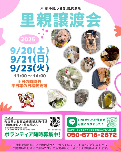 | イベント内容 | \9月23日に譲渡会を開催します/ 子犬や子猫、小型犬から大型犬、かわいい猫ちゃんたちまで、たくさんの保護犬・保護猫が皆さんを待っています! 写真だけでは伝えきれない魅力が盛りだくさんなので、ぜひお気軽に足を運んでくださいね。 【里親募集中の犬猫情報はコチラ】 https://satoya-boshu.net/foster/?@button_name@=search&FosterParent_MemberID=85262 ●事前にお電話かショートメールでご予約をお願いします。 ・予約番号:090-6718-2672 ●ご希望の犬猫がいましたら、予約時に名前をお伝えください。 ●当日までに譲渡が決定した・体調がすぐれないなど、やむを得ない理由で急きょ不参加の場合があります。ご了承ください。 ●その場での引き渡しはしておりません。譲渡決定後、距離にかかわらずこちらからお届け致します。 みなさまのご来場をお待ちしております! ⚫︎りぼんは、奈良県で活動している動物保護団体です。 犬・猫・うさぎなどの小動物・インコやニワトリなどの鳥・両生類・爬虫類など動物種を問わず、お届け先も地域を問わず、動物たちと里親さまをつなぐ活動を行っています。 ◎ホームページ https://ribbon-foster.jimdofree.com/ ◎公式YouTube https://www.youtube.com/@ribbon-shelter https://www.instagram.com/ribbon_shelter1/ |