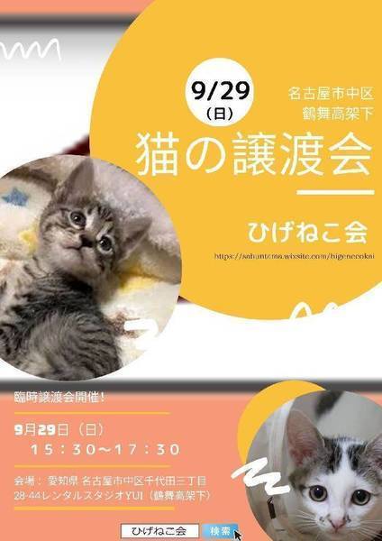 | イベント内容 | 月齢1.5ヶ月から5ヶ月くらいまでのこねこ臨時譲渡会開催☆ ちび猫ちゃんから、中猫さんたちが15ねこくらい参加予定です。 ※体調により不参加の場合がございます。 (気になる子がいましたら個別にお問い合わせお願いします。) 日時 9月29日(日) 15時30から17時30分まで 会場 JR・地下鉄鶴舞駅から徒歩5分 スタジオYUI(鶴舞高架下) 駐車場 鶴舞交差点~南のJR中央線ガード西側道路は休日駐車禁止解除になっています。 (休日駐禁解除区間に空きが無い場合は、コインパーキングをご利用ください。) ☆参加予定猫は、ひげねこ会HPでご確認ください。 https://sabuntama.wixsite.com/higenecokai ☆ドッグプランニング参加予定猫はこちら ↓ https://profile.ameba.jp/ameba/avydai 皆さまのお越しお待ちしています☆ |