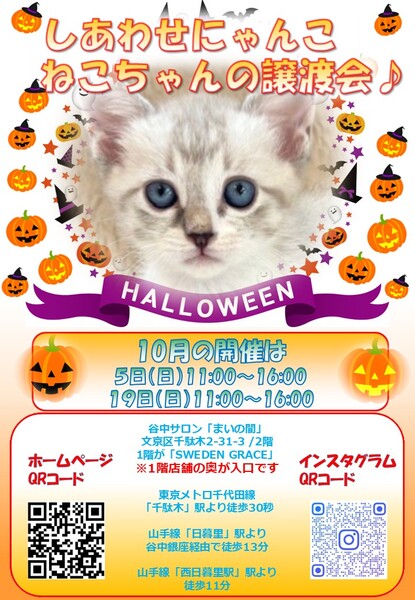 | イベント内容 | 「しあわせにゃんこ」は行き場のない猫ちゃんと里親様との 出逢いの場を提供するグループです♪ 子猫も成猫もハンデのある猫もみんな新しい家族を待っています♪ みなさまのご来場を保護主、スタッフ一同心よりお待ちしております♪ 詳しくはホームページ譲渡会情報をご確認願います。 http://www.shiawasenyanko.net まだまだちびっこシーズンは続きます♪ 可愛いコ達をお迎えしませんか? ◆開催日/開催時間◆ 2025年10月5日(日) 11:00~16:00 ご希望の猫ちゃんがいらっしゃる場合は11時30分までに受付をお願い致します。 複数のお申し込みがある場合は11時30分で受付を終了させて頂く場合がございます。 受付をされた全ての里親様とお見合いをさせて頂きます。 ※先着順ではございません。 ※当日、猫ちゃんを連れて帰ることは出来ません。 後日調整のうえ保護主が里親様宅へお届けいたします。 ◆会場◆ 受付はまいの間1階です♪ ※お店の奥に会場への階段がございます♪ 譲渡会場:東京都文京区千駄木2-31-3 1階が北欧雑貨ショップ「SWEDENGRACE」 2階が谷中サロン「まいの間」 ※詳しいアクセスはホームページをご覧下さい http://www.shiawasenyanko.net 谷中サロン「まいの間」の情報はこちら http://neko-to-kyo.com/#maima ◆交通手段◆ 東京メトロ千代田線「千駄木」駅より徒30秒 JR山手線「西日暮里」駅より徒歩11分 JR山手線「日暮里」駅より谷中銀座経由で徒歩13分 ※お車でご来場の際、駐車場のご用意はございません。 近隣のコインパーキング等をご利用ください。※近隣に沢山あります。 いつ里の掲載参加猫一覧はこちらから https://satoya-boshu.net/mypage/foster_list.php?@ps@=none アメーバブログの里親募集にゃんこはこちら https://ameblo.jp/shiawasenyan-ko/theme-10092719565.html ◆猫ちゃんとのお見合い◆ 掲載している猫ちゃんは基本的に譲渡会場でのお見合いのみとなります。 譲渡会への参加が決定している猫ちゃんはその譲渡会で里親様が決定しなかった場合のみ保護主宅でのお見合いが可能となります。 自宅お見合いを希望される里親様はメール(info@shiawasenyanko.net)にてご相談ください。 ◆当譲渡会では猫ちゃんと里親様のスキンシップを大切にしています◆ 新しい家族として20年以上いっしょに暮らしていく猫ちゃんです。 譲渡会場でたくさんの猫ちゃんと触れ合って良きパートナーを見つけてください。 はじめて猫ちゃんを迎える不安や先住猫ちゃんとのトライアルの注意点、猫ちゃんと里親様の暮らし方など気軽にご相談ください。 経験豊富な保護主や猫大好きスタッフがアドバイスさせていただきます。 ◆子猫ご希望の里親様◆ 子猫は急な下痢や発熱等により体調が急変し、数時間対応ができなかっただけでも命を落とす事があります。 その為、当譲渡会では月齢によりお留守番のない又は少ないご家庭への譲渡に限らせて頂いております。 また里親様と子猫ちゃんが安心してトライアル期間を過ごせるよう体重が1㎏程になってからのお届けとさせて頂いております。 ◆里親希望のみなさまへ◆ ご家族の皆様で生涯、家族の一員としてたっぷり愛情を注いでくださるご家庭をお待ちしております。 下記に該当する希望者様へ ・独身、単身者の方 ・友人同士、同棲でのお住まいの方 ・高齢者のみのご家庭の方 は、ご相談の上、譲渡を判断させて頂きます ・適正飼育の不可能な方 ・脱走防止対策を考えて頂けない方 ・定期報告の不可能な方 は、ご遠慮下さいますようお願い致します ◆ご負担頂く費用について◆ 譲渡の際に譲渡負担金(医療費の一部、譲渡金、お届け時の交通費)を里親様にご負担頂く事により 過酷な状況にいる猫ちゃんを保護し新しいご家族の元へ送り出す事ができています。 皆様のご理解とご協力にボランティア一同、心より感謝しております。 ご負担頂く医療費につきましてはホームページに詳しく記載させて頂いております。 http://www.shiawasenyanko.net/onegai.html しあわせにゃんこホームページ http://www.shiawasenyanko.net メールでのお問い合わせ info@shiawasenyanko.net |