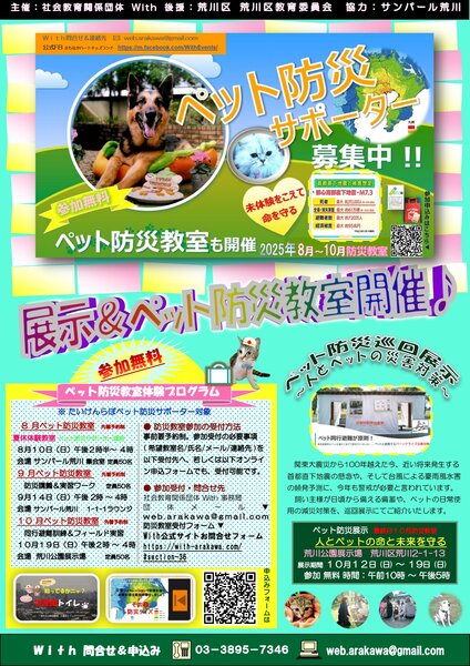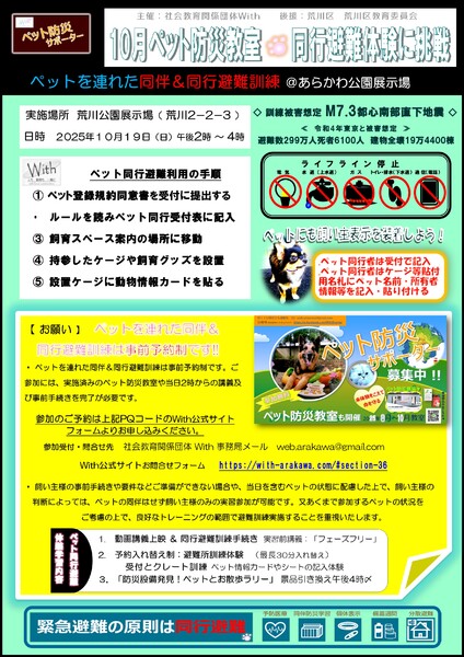 | イベント内容 | □◼️ペット防災展示10/12~10/19開催◼️□ 同行避難訓練は10/19(日)防災教室で実施! Withでは『ペットと飼い主の命と未来を守る』をテーマに、10月は防災展示と同行避難訓練を開催します! どちらも会場は、荒川区役所まえ荒川公園展示場です。 是非この機会に、ご予約の上ペットを連れた同行避難訓練へご参加ください! 会場:荒川公園展示場 116-0002 東京都荒川区荒川2丁目1−13 防災展示〔申込不要・開場時間午前10時~午後5時〕 10/19ペット防災教室【 同伴避難訓練 】 事前予約(入れ替え制) 時間 午後2時~4時開催 詳しくはこちら ? 荒川区HP https://www.city.arakawa.tokyo.jp/a032/pet/bosaikyoshitsu_20251019.html ペット防災ボランティア希望の方 ?東京都100年活躍ナビ https://100nen-navi.metro.tokyo.lg.jp/event/detail/1573 |