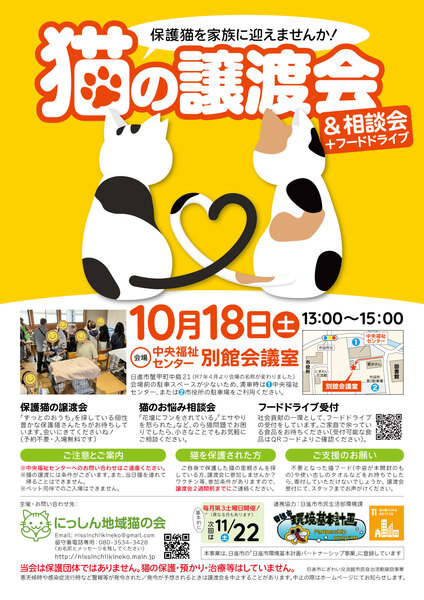 | イベント内容 | 10月18日(土)に「猫の譲渡会&相談会」を開催いたします。 保護猫を迎えたい方はもちろん、猫に関する相談会も同時開催しております。 ご近所との猫トラブルなどでお悩みの方も、どうぞお気軽にお立ち寄りください。 地域貢献の一環として、フードドライブの受付もしております。 ご家庭や職場で余っている食品がありましたらぜひお持ちください! 小さな譲渡会ですが、猫さんも人間も良いご縁を紡げられるよう、のんびり続けています。 遊びにきてくださいね(*^^*) 【日時】10月18日(土)13:00〜15:00 【会場】中央福祉センター「別館会議室」 ★★★ご注意★★★ 中央福祉センター本館内ではなく、その隣の奥まったところにある小さな建物「別館会議室」にて開催しております。お手数ですが、HPにて地図をご確認ください(中央福祉センターへのお問い合わせはご遠慮ください)。 ★★★★★★★★★ 【入場無料・予約不要】 【主催】にっしん地域猫の会 【ホームページ】https://nissinchiikineko.main.jp ※会場前に駐車場がございますが、数が少ないため、満車時は本館の駐車場をご利用ください。図書館のむかいにある市役所の臨時駐車場もご利用いただけます。 ※室内換気のため冷暖房が効きにくい場合がございます。 ※ペット同伴のご入場はできません。 ※猫ちゃんの譲渡には条件がございます。詳細はホームページをご参照ください。 |