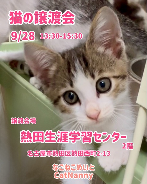 | イベント内容 | 子猫から成猫まで可愛い保護猫達が優しい家族との出会いを求めて譲渡会に参加します。気さくなスタッフがどんな質問にもお答えしますので、譲渡会が初めてという方も安心してお気軽にお越しください。 ちょっと覗いてみたい、猫を飼ってみたい、2匹目を考えているそんな多くの人達にお越し頂いております。 先ずはおひとりで、ご家族で猫達と触れ合いに来て下さいね♪ |