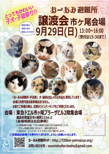 | イベント内容 | 可愛い仔犬・仔猫・成猫がたくさん、出場しますよ! 当日にはご来場できないかたも、ぜひお問い合わせください。 別日にお見合いの設定も可能です。 どうぞ、よろしくお願いします。 ☆★☆★☆★☆★☆★☆★☆★☆★☆★☆★☆★☆★☆★☆★☆★☆★☆★☆★☆ ~9月29日(日)市ヶ尾にて里親会開催!~ ◎場所・・「東急ドエル市ヶ尾プラーザビル2階集会場」 横浜市青葉区市ヶ尾町1154-2 東急田園都市線「市ヶ尾」駅より徒歩2分 ◎日程・・9月29日(日)(雨天決行) ◎時間・・13時から16時(受付は15時30分まで) (駐車場はございません。お車でお越しの際は近隣のコインパーキングをご利用ください) ■当日ご来場の方全員にアンケートを記入して頂きます。 ■下記リンクより事前にアンケートをご記入いただくと、待ち時間が短縮されます。 ★ 猫ご希望のかた向けアンケート https://goo.gl/ZNRFtI ★ 犬ご希望のかた向けアンケート https://goo.gl/pwWUMj ■アンケートで頂戴した個人情報は適切に管理し、里親さま決定のための資料としてのみ使用いたします。 ■アンケートをご提出いただいても、譲渡をお約束するものではないことをご承知置きください。 ※参加予定の猫は体調により参加できない場合があります。ご了承ください。 ※詳細はお問い合わせいただくか、ブログ・HPをご覧くださいませ。 おーあみ避難所ブログ:http://ameblo.jp/oami-hinanjyo おーあみ避難所HP:http://www.geocities.jp/oami_hinanjyo/ ☆★☆★☆★☆★☆★☆★☆★☆★☆★☆★☆★☆★☆★☆★☆★☆★☆★☆★☆ |