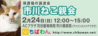| イベント内容 | 苅谷動物病院市川橋病院さまのご厚意により、同病院に併設された<アドバンストケアプラザ>にて、ちばわんねこ親会を開催させて頂く事になりました。 可愛い保護猫たちが新しい家族との出会いを求めて参加します!! 見学は予約等必要ありません。ぜひお誘いあわせの上ご参加ください。 参加猫情報は順次更新されます。 ちばわんHPをご覧ください。 http://chibawan.net/eventcat/eventall ※ちばわん猫のインスタグラムのアカウントが出来ました。 日々の様子はこちらでもご覧いただけます https://www.instagram.com/chibawan_cat/ ◆◆◆◆◆◆◆◆◆◆◆◆◆◆◆◆ 日時 2月24日(日)12:00-15:00 場所 ACプラザ 苅谷動物病院 市川橋病院 <アドバンストケアプラザ> 〒272-0034 千葉県市川市市川2-6-14 室内開催 雨天決行(荒天中止) ◆◆◆◆◆◆◆◆◆◆◆◆◆◆◆◆ 【会場内でのお願い】 ・当日、会場内への犬猫等の愛玩動物の同伴は出来ません。 ・会場内は<土足不可>です。スリッパなど室内履きをご持参いただきますようお願い致します。 ・譲渡が決定した場合、後日猫をご自宅へお届けいたします。当日猫をお引渡しすることはございません。 【電車からのアクセス】 JR総武線・総武快速線 市川駅より約徒歩7分 京成線 国府台駅より約徒歩8分 ※本ねこ親会にご来場される方は市川橋病院の駐車場利用はできません。 車でお越しの場合は、付近のコインパーキングをご利用ください。 電車・バスなどの公共の交通機関の利用をお勧めいたします。 【当日の流れ】 (1)家族募集中のねことお会いになりたい方はどなたでも自由にご参加いただくことができます。ちばわんボランティアは名札をつけておりますので、お声をかけて下さい。 預かりボランティアが控えておりますのでねこの性格や生活習慣など、遠慮なくご質問ください。 (2)ご希望の子が決まったら、お申し込みアンケートにご記入の上、ボランティアにお渡し下さい。 (前日までにメールでアンケートを送信してお申し込みいただくこともできます。) ◆「ねこ」アンケート送信先:(以下URLをクリックするとフォームが開きます) http://chibawan.net/contactform_cat (3)アンケート内容を拝見し、お話させていただきます。 (4)原則として一両日中にお返事の連絡をさせていただきます。 (5)ご縁が成立した場合には、後日、こちらからご自宅まで猫をお届けし、約1ヶ月のお試し生活に入っていただきます。お届けの際に、書面での譲渡契約書を交わします。 ※ワクチン・不妊手術代など保護にかかった費用は、家族になる方にもご負担をお願いしています ◆ねこ親会について:(以下URLをクリックするとフォームが開きます) http://chibawan.net/inquiry_cat ※イベント当日はメールを見ることが出来ません。また、お問い合わせの際は、必ず「具体的な件名」を入れて多数の迷惑メールと区別がつくようにお願いいたします。 ※業務に支障がでる恐れがありますので本イベントに関する苅谷動物病院さまへのお問い合わせはご遠慮ください。 |