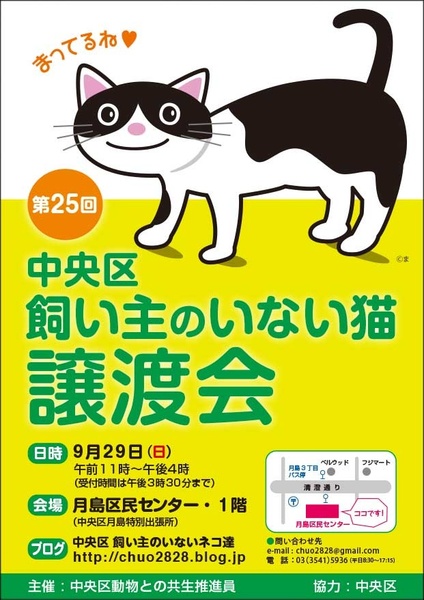 | イベント内容 | 「中央区 飼い主のいない猫 譲渡会」 東京都中央区月島区民センター 1階 会議室で、猫の譲渡会を開催します。 主催 : 中央区動物との共生推進員 協力:中央区保健所 開催日 : 9月29日(日)11時〜16時(最終入場15時30分) 会場 : 東京都中央区月島4丁目1-1 月島区民センター 1階 会議室 地下鉄 有楽町線 月島駅 徒歩3分 地下鉄 大江戸線 月島駅 徒歩3分 ⭐️猫の譲渡に関しては、猫によって譲渡の、条件が異なりますので、会場で保護主と、直接、お話していただくよう、お願いしております。 ⭐️ 仔猫については、体調が不安定な為、留守時間の長い方や、一人暮らしの方などは、お勧めすることができませんので、ご了承ください。 ⭐️当日は、猫を連れて帰ることは、できません。 保護主と、日時を相談していただき、自宅までお届けいたします。 ⭐️参加予定の猫は、体調不良などにより、不参加になることがありますが、ご了承ください。 詳しくは、ブログをご覧ください。 http://chuo2828.blog.jp 【お問い合わせ先】 chuo2828⚫︎gmail.com 又は、 minimyu2014⚫︎yahoo.co.jp ⭐️迷惑メール防止の為、@を⚫︎で表示しています。 【お急ぎの方は】 電話:090-4412-6396 竹内(中央区動物推進員) ご連絡は、昼12時〜夜12時で、お願いします。 |