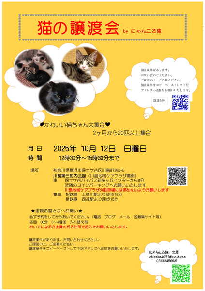 | イベント内容 | 猫ちゃんの譲渡会を開催いたします。 1ヶ月位からの猫さん30匹位 大人猫さんも参加です。 月 日 2025年 10月 12日 日曜日 時 間 12時30分~15時30分まで 場所 神奈川県横浜市保土ケ谷区川島町360-6 川島第三町内会館(川島地域ケアプラザ裏側) 車 保土ケ谷バイパス新桜ヶ丘インターから8分 近隣のコインパーキングにお願いいたします。 (手前にある川島地域ケアプラザの駐車場には停めないでください) 電車 相鉄線 上星川駅より徒歩10分 相鉄線 西谷駅より徒歩15分 ★里親希望さまへお願い★ 必ず予約をしてからおいでください。 各回 30分 3~4組様 おいでになる方全員の氏名住所を記入をお願いいたします。 譲渡条件があります。お問い合わせください。 ご確認の上、ご応募ください。 猫の譲渡について http://nyankorotai.blog.fc2.com/blog-category-5.html 上記の譲渡条件をコピーペーストして下記アドレスへ送ってください。 追ってご連絡いたします。 お電話にても受付いたします。 下記の譲渡条件を送ってくださっても大丈夫です。 ◆ご応募時に下記事項をお知らせください◆ 1.お名前、簡単な住所 2.先住動物の有無(ワクチン 不妊手術の有無等)と選んだ理由 3.家族構成(家族全員の年齢 関係 お仕事等) 4.住宅環境(一戸建て 分譲マンション 一戸建て賃貸 賃貸マンションペット可) 5.留守番の時間 6.下記の①~⑨までの同意 ◆応募者様へのお願い◆ ①一生涯、家族の一員としてくださる事(猫は20年生きます) ②完全室内飼いでお願いします。 (脱走防止対策をお願いします。ケージ 脱走防止扉 玄関窓等) ③不妊手術及び毎年のワクチン接種など健康管理 (不妊手術済のご連絡は必須) ④家族全員の同意があること ⑤ペット可住宅にお住まいであること。 (ペット不可にお住まいの方には譲渡できません) ⑥身分証明の提示及び誓約書を記入していただきます。 ⑦譲渡後の近況報告をしていただける方 ⑧譲渡費用等をご負担できる方 (初期医療行為は済ませてお届けします) ⑨ほとんどの猫さんがお外から保護した子です。 その辺の事をご理解していただける方 猫が小さい場合はお留守番の短い家を希望します。 ケージのご用意をお願いいたします。 申し訳ありませんが先住動物さんが4匹以上のご家庭はお断りさせていただいております。 無職 学生 未成年の方からの申込は受け付けておりません。 ご家族に未就学児のいるお家及び高齢者の方は要相談 2匹一緒を優先させていただきます。 双方の条件が合った場合は譲渡会又は保護先にお見合にきていだだき成立後に自宅室内へお届けいたします。 この時期なので近くに方を優先させていただく事もあります。 ご予約お待ちしております。 にゃんころ隊 http://nyankorotai.blog.fc2.com 担当 北澤(にゃんころ隊) chieminn4057@icloud.com |