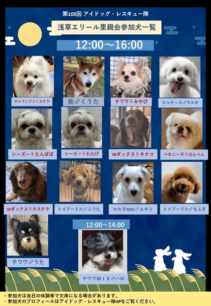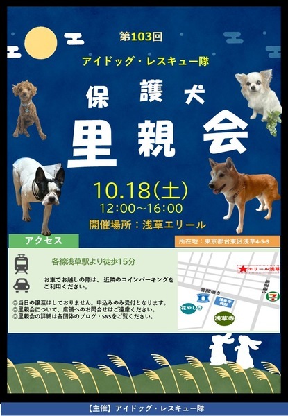 | イベント内容 | 『第103回アイドッグ里親会』開催のお知らせ 以下の通り、里親会を開催します。 日時:10月18日(土) 12:00~16:00 会場:浅草エリール3階(ローソン隣) https://erile.co.jp/ 住所:東京都台東区浅草4-5-3 アクセス:浅草駅より徒歩15分 (東京メトロ銀座線・東武スカイツリー線・都営浅草線・つくばエクスプレス) ※室内は密になりやすいため、マスクの着用を推奨します。 ※犬をお連れの方は、オムツやマナーベルトの着用をお願い致します。 フリーで遊ばせることは出来ませんので、リードの着用をお願い致します。 ⭐︎皆様のお越しをお待ちしています⭐︎ |