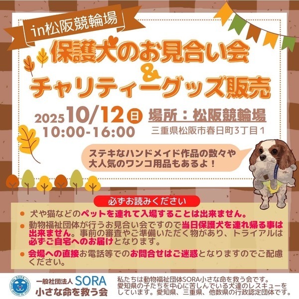 | イベント内容 | 三重県松阪市の松阪競輪場で開催されます、わんにゃんフェスティバルにて保護犬のお見合い会とチャリティーグッズ販売をさせていただきます。 ぜひ可愛い保護っ子達に会いに来て下さいね。 ※わんこ、にゃんこ入場不可です チャリティーグッズ販売の収益は、全て保護犬の医療など保護活動に使わせていただきます。 事前のお申込みは不要です。保護活動ブログで、開催日の数日前に譲渡会参加が決定したワンコたちのご案内もしておりますので、ご希望のワンコの参加をご確認してお越し頂けますと幸いです。 SORA公式ホームページ https://sora-chiisana.org/foster/ SORA公式活動メインブログ https://ameblo.jp/sora-chiisana-inochi/ SORAイベントブログ https://ameblo.jp/sora-charity-events/ |