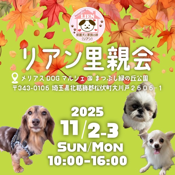 | イベント内容 | 当日開催のメリアスDOGマルシェ内で、保護犬の譲渡会ブースとして参加いたします。 参加は無料です。 お目当ての子が決まっておりましたら、リアンHPより予めご予約をいただけますとご案内がスムーズです。 「保護犬ってどんな子達なのかな」 「お迎え予定は決まってないけど話を聞いてみたい」 「とりあえず見てみたい!」 どんなきっかけでも構いません。 是非覗きにいらしてください。 ご来場をお待ちしています! |