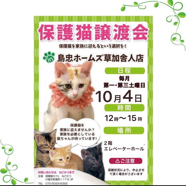 | イベント内容 | *保護猫譲渡会* 日時:10/4(土) 12時~15時 場所:ホームズ草加舎人店さま 島忠ホームズ草加舎人店さま譲渡会に参加予定です。 センターからの引き出し、飼育崩壊や所有権放棄などで、生きる場所を失った猫たちが、最大限の医療にかけてピカピカになりました。 写真の猫の他にも甘えっこちゃんたちが、溢れる笑顔でお待ちしています。 ぜひご参加ください。 ***譲渡条件*** *完全室内でお願いします *逸走防止対策にご協力頂ける方 *写真付きの身分証をご提示頂ける方 *LINE若しくはメールでのやりとりが可能な方 *譲渡に関する覚え書きにご署名頂ける方 *初期医療費をご負担頂ける方 *その他の譲渡条件を、譲渡会場でお話させて頂ける方 *猫が生まれた年から20年後に、80歳を超えていない方 *お一人暮らしの方は、後見人さまのご同席が必要です |