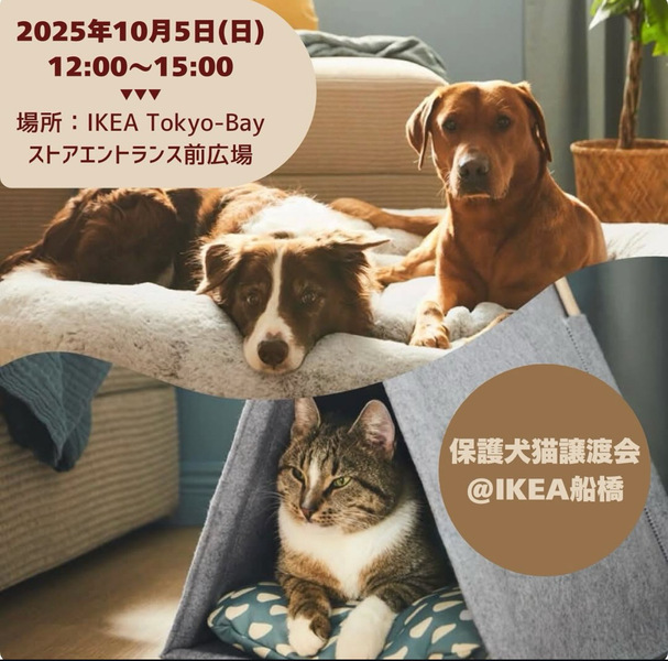 | イベント内容 | IKEA TOKYO BAY(IKEA船橋)で保護犬猫譲渡会が開催されます!!! ◼︎日程 2025年10月5日(日) 12時〜15時 ◼︎場所 IKEA TOKYO BAY(IKEA船橋) 千葉県船橋市浜町2丁目3−30 ストアエントランス前広場 ※外会場のため、雨天の場合中止の可能性あり ぜひお越しください! ◼︎主催 みさと動物愛護クラブ ◼︎問い合わせ先 保護猫カフェねこかつ 070-5029-8392 |