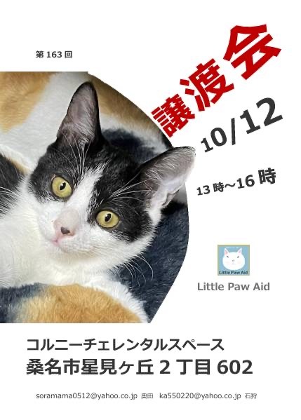 | イベント内容 | 日時 10月12日(日)13時~16時 場所 セオコルニーチェレンタルスペース 三重県桑名市星見ヶ丘2丁目 子猫参加します みんな可愛い子達です 慣れている成猫も参加します 慣れてない子もゴロゴロの甘えん坊もみんな個性的で可愛いです 猫を飼いたいと思っている方も猫を見てみたいと思っている方もお気軽に遊びに来て下さい それぞれの保護主により譲渡条件があります 当日猫を連れ帰る事はできません。 参加猫は保護主のブログで確認ください。 ◆参加者 リトルパウエイド https://blog.goo.ne.jp/ka550220/e/da0fa7f743a938b9030d35e95e0a0263 http://blog.livedoor.jp/cats_voice_pawaid/ ほんわか猫な日々 https://blog.goo.ne.jp/soramama はるごまいけのブログ http://ameblo.jp/harugoma3futagozaru/ 予約は不要です 連絡先 soramama0512@ezweb.ne.jp 奥田 |