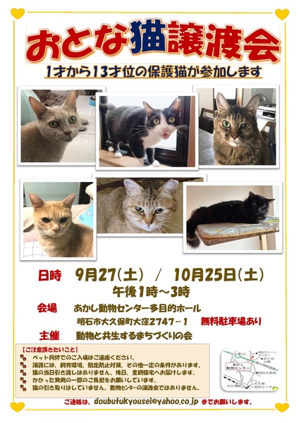 | イベント内容 | さまざまな事情をかかえ、ボランティアさんに保護されている保護猫が参加します。飼い主が高齢で、命の終わりまでお世話ができない猫、悪質なブリーダーから救出した猫、脳に障害のある子・・・みんな暖かい家庭を求めています。あかし動物センターは、大変環境のよい施設です。ぜひ、お立ち寄りください。 | ||