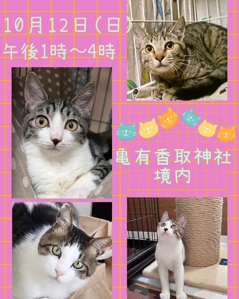 | イベント内容 | 様々な理由で保護された猫達、それぞれがあたたかな手を必要としています。 その猫の個性を良く理解し確実なご縁を繋ぐ為、多くの猫達を保護する事は出来ませんが大切な出会いを探しています。お迎えする方の環境や生活スタイルに適した猫さんをご紹介できますので、どういう猫がいいのかと迷っている方へのご相談も受けています。どうそお気軽にいらしてみて下さい。 保護猫譲渡会@亀有 10月12日(日) 東京葛飾区亀有3-42-24 亀有香取神社境内 午後1時~4時 JR亀有駅南口より徒歩5分 ※譲渡会へお越し下さる方は近隣コインパーキングへ駐車頂きますようお願い申し上げます。 【猫の里親をさがす会】 https://x.com/shosukereiko https://blog.goo.ne.jp/bobton 家族の一員として生涯たっぷり愛情を注いでくださるご家庭をお待ちしています。できましたらご家族形態の方は皆さまでいらして下さい。 【以下の方には譲渡しておりません】 ・猫の飼育が許可されていない住居にお住まいの方 ・未成年者、友人同士&同棲でお住まいの方 ・乳児のいるご家庭、妊娠中の方 ・お引越し予定の方 ・60歳以上の方への子猫譲渡✖ 成猫については猫年齢に見合った年の方に譲渡検討しています。 ・脱走防止対策にご協力頂けない方 ・経済的に不安定な方(休職中、就職活動中、アルバイト、生活保護等) ・猫だけで留守番をする時間が長いなどご希望に沿えない場合があります。 ・住居の構造をお聞きする事があります。(階下への騒音など) ・犬猫を4頭以上飼育している方 他、飼育に適切でないと判断した場合(個体により条件が若干違います) 【当里親会は猫さんと里親様とのマッチングを大切にしています】 はじめて猫さんをお迎えする場合に適した猫さん、お留守番の長い里親さんに適した猫など、ご状況に合わせてアドバイスしています。 【ご負担頂く費用について】 譲渡の際に活動協力金を里親様にご負担頂く事により飼い主のいない猫の継続的治療や保護、新しいご家族の元へ送り出す事ができます。 ご理解とご協力をお願い致します。 ◆活動協力金(譲渡費用)のご負担がございます。 ★成猫(マイクロチップ挿入済)1頭35.000 譲渡会に参加している成猫は不妊去勢が済んでいます。 健康チェック、ワクチン、ウイルスチェック、駆虫、検便、済。 ★子猫1頭20.000 健康チェック、ワクチン、ウイルスチェック、駆虫、検便、済 (マイクロチップ未挿入) |
