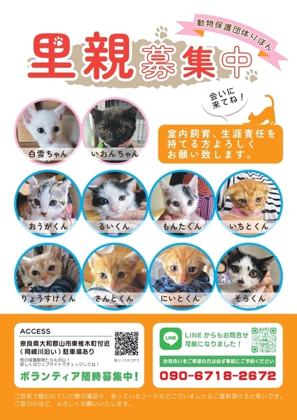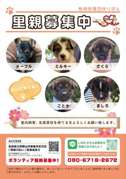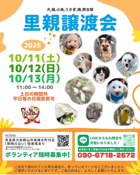 | イベント内容 | \10月4〜5日に譲渡会を開催します/ 子犬や子猫、小型犬から大型犬、かわいい猫ちゃんたちまで、たくさんの保護犬・保護猫が皆さんを待っています! 写真だけでは伝えきれない魅力が盛りだくさんなので、ぜひお気軽に足を運んでくださいね。 【里親募集中の犬猫情報はコチラ】 https://satoya-boshu.net/foster/?@button_name@=search&FosterParent_MemberID=85262 ●事前にお電話かショートメールでご予約をお願いします。 ・予約番号:090-6718-2672 ●ご希望の犬猫がいましたら、予約時に名前をお伝えください。 ●当日までに譲渡が決定した・体調がすぐれないなど、やむを得ない理由で急きょ不参加の場合があります。ご了承ください。 ●その場での引き渡しはしておりません。譲渡決定後、距離にかかわらずこちらからお届け致します。 みなさまのご来場をお待ちしております! ⚫︎りぼんは、奈良県で活動している動物保護団体です。 犬・猫・うさぎなどの小動物・インコやニワトリなどの鳥・両生類・爬虫類など動物種を問わず、お届け先も地域を問わず、動物たちと里親さまをつなぐ活動を行っています。 ◎ホームページ https://ribbon-foster.jimdofree.com/ ◎公式YouTube https://www.youtube.com/@ribbon-shelter https://www.instagram.com/ribbon_shelter1/ |