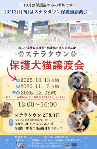 | イベント内容 | *保護猫譲渡会* 日時:10/13(月・祝)13時~16時 場所:ステラタウンさま 飼育崩壊や所有権放棄などで、生きる場所を失った猫たちが、最大限の医療にかけてピカピカになりました。 写真の猫の他にも甘えっこちゃんたちが、溢れる笑顔でお待ちしています。 ぜひご参加ください。 ***譲渡条件*** *完全室内でお願いします *逸走防止対策にご協力頂ける方 *写真付きの身分証をご提示頂ける方 *LINE若しくはメールでのやりとりが可能な方 *譲渡に関する覚え書きにご署名頂ける方 *初期医療費をご負担頂ける方 *その他の譲渡条件を、譲渡会場でお話させて頂ける方 *猫が生まれた年から20年後に、80歳を超えていない方 *お一人暮らしの方は、後見人さまのご同席が必要です |