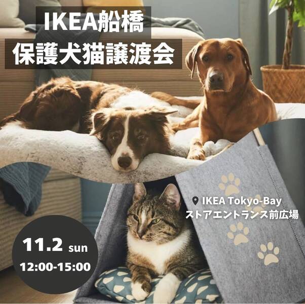 | イベント内容 | IKEA TOKYO BAY (IKEA 船橋店) 保護犬猫譲渡会が開催されます♪♪♪ ✼日程 2025年11月2日(日) 12時〜15時 ✼場所 IKEA TOKYO BAY (IKEA 船橋店) 千葉県船橋市浜町2-3-30 ストアエントランス前広場 ✼外会場のため、荒天の場合は中止 家族を必要としている たくさんの保護犬や保護猫たちとお待ちしています! ぜひお越しください! ✼主催 みさと動物愛護クラブ(@misato_animal) ✼問い合わせ先 保護猫カフェねこかつ |