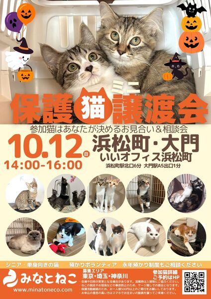 | イベント内容 | みなとねこが毎月定期開催している譲渡会です 今回はお見合い会&相談会として少人数でいろいろご相談いただく会となります。 参加猫はご指名があった猫となります。ご予約時にご指名をお願いします。 ※ご予約後に参加調整を行います 通常の大きな譲渡会ではなかなか相談しづらい、という方も多いので、、、 たくさんの猫を見てみたいという方はぜひ10/26(日)麻布十番、11/3(月祝)六本木ミッドタウン をご検討ください。 浜松町駅から徒歩6分、大門駅A4出口より徒歩1分の会場での開催となります。 ※当日はみなと区民まつりが開催されておりますので、ご注意ください ご予約はみなとねこのHPよりお願いします https://www.minatoneco.com/event 会場や参加猫の詳細はこちら https://www.minatoneco.com/gallery ※参加猫たちの様子はみなとねこの各種SNSもご覧ください https://linktr.ee/minatoneco 子猫は2匹ペアでの譲渡が原則です 初めての方こそ最初から2匹をお勧めしています また私たちボランティアは、ご縁のあった猫たちに終生里親様に愛されて幸せに安全に暮らして欲しいと願っています このため里親になっていただくにはいくつかの条件やお約束事があります。 ◆基本条件 (猫それぞれ、保護主により異なります) ・ ご家族全員が飼育に賛成であること ・ペット可物件での完全室内飼い、エアコンなどによる室温管理、医師の指示に従い定期的な受診やワクチン接種、 適切な時期(生後4ヶ月中)での避妊去勢、病気予防に配慮したフードの選択、終生飼養をお願いしております。 ・ケージのみの飼育、リビング以外の一室のみでの飼育は不可です。十分な運動のスペースと窓から景色が眺められのんびり日向ぼっこが可能な環境が望ましいと考えています。 ・誤食などの事故防止のため、お部屋の整理整頓や脱走防止にも万全の対策をお願いします。 ・換気が十分でない室内での喫煙をされる方はお断りしております。 ・日々のお世話だけでなく、スキンシップが可能な精神的・時間的・経済的な余裕がある方に限らせていただきます。猫が20年以上生きる中でなるべく変わらぬ環境で愛情を注いで頂けるよう、家族構成やお仕事、お住まいに変化のない方を優先させていただきます。 またお届けやフォローの都合上、募集エリアも東京、神奈川、埼玉に限らせていただいております。 ■里親申込書類一式はみなとねこHPよりダウンロードをお願いします https://www.minatoneco.com/foster-entry 会場では里親申込書を拝見して簡単なヒアリングを行います 会場にてご記入いただくことも可能ですが、希望の方が多いとお待ちいただくことになりますので、お手元で印刷していただきご記入の上ご来場いただくことをおすすめしております ※ご家族にアレルギーがある方、喫煙者がいる場合には是非事前にご相談ください ※猫と暮らしたことのない未就学児がいらっしゃる場合には事前にアレルギー検査などお勧めします 実際の参加予定猫 譲渡会前日の21:00までにみなとねこのHPやFacebookページでご紹介します https://m.facebook.com/minatoneco/ 直接ご応募の方は詳細をLINEなどでやりとりの上で預かり宅でのお見合いも行っております。 ※換気のためにドアをオープンしての開催のためにケージ越しでのご対面となりますことご理解ください ※譲渡会の開催や保護活動の継続のため、お一人様500円以上のご寄付をお願いしております |