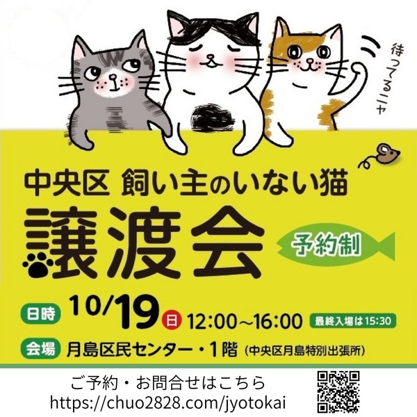 | イベント内容 | 中央区では様々な事情で飼い主のいないネコ達にずっとのおうちを見つけるために中央区動物との共生推進員が中心となって、譲渡会を定期開催しており今回で48回目を数えます。 区内の高齢者からの引き取りネコなど大人猫はもちろん、 子猫たちも参加します。 ※お届けやフォローの関係で中央区在住の方や隣接区在住の方を優先させていただきます。 ※猫の多くは春に生まれますので今の時期は生後半年過ぎた手術の終わった体調も安定した子猫や大人猫が中心です。 お留守番が長い方や初めて猫を飼う方でも飼いやすい子も参加します。 ネコとの暮らしをご希望されている方、ネコのお預り希望の方、またネコとの暮らしについて色々ご質問がおありになる方、皆様のご来場をお待ちしております。 ※里親を希望される方は、本人確認できる物をご持参の上、当日会場まで直接お越し下さい。 会場内の混雑を防ぐため、事前に来場希望時間と来場予定人数をご連絡ください。 <譲渡会> 開催日:2025年10月19日(日曜日) 開催時間:12:00〜16:00(最終入場時間15:30) 会場:中央区月島区民センター 1階会議室 譲渡会の事前お申し込みはこちらから → https://www.chuo2828.com/jyotokai 里親さま募集中の猫ちゃんはこちら → https://www.chuo2828.com/catslist 参加猫の情報は、譲渡会の1週間前くらいにWebに掲載する予定です。 今回も1匹でも多くの猫さんたちに、新しい家族とのご縁が繋がりますように。 |