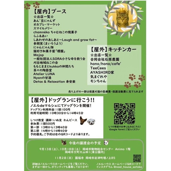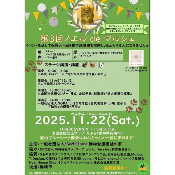 | イベント内容 | 『ノエルdeマルシェ』に一般社団法人SORA小さな命を救う会も、講演や防災グッズ販売、ガラガラくじで参加させていただきます。 収益は、全て保護犬の医療など保護活動使わせていただきます。 是非、ご家族みなさんで遊びに来てくださいね。 * 屋内ブースのブルーシートエリアはワンちゃん入場可能 * 小雨決行 先住ワンちゃんを一緒にお連れの際は必ずマナーオムツ着用をお願いします。 マナーオムツの着用がない場合は、その場でマナーオムツをご購入頂くか、もしくは、ご入場をお断りすることがあります。ご了承下さい。 SORA公式ホームページ https://sora-chiisana.org/foster/ SORA公式活動メインブログ https://ameblo.jp/sora-chiisana-inochi/ SORAイベントブログ https://ameblo.jp/sora-charity-events/ |