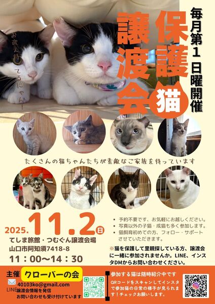 | イベント内容 | 11月2日(日) 11時〜14時30分 てしま旅館 猫庭 つむぐん譲渡会場 11月は終了時間が30分遅くなっています。 お時間調整の上、是非ともご来場ください? 猫ちゃんと触れ合える譲渡会です。 猫の温もりに癒されてみませんか。 猫飼育始めての方も多くご来場いただいています。 出来る限りのフォローサポートさせていただきます。 猫との生活始められませんか。 お待ちしています。 譲渡会までに個別面会可能な子もいます。 気になる子、D Mからお問い合わせください。 猫を保護して里親探しをしている方、譲渡会に一緒に参加しませんか。DMからお問い合わせお願いします。 #譲渡会 #保護猫 #山口市#美祢市 #宇部市 #防府市#萩市#山陽小野田 #子猫 #成猫 #つむぐん譲渡会 #クローバーの会 |